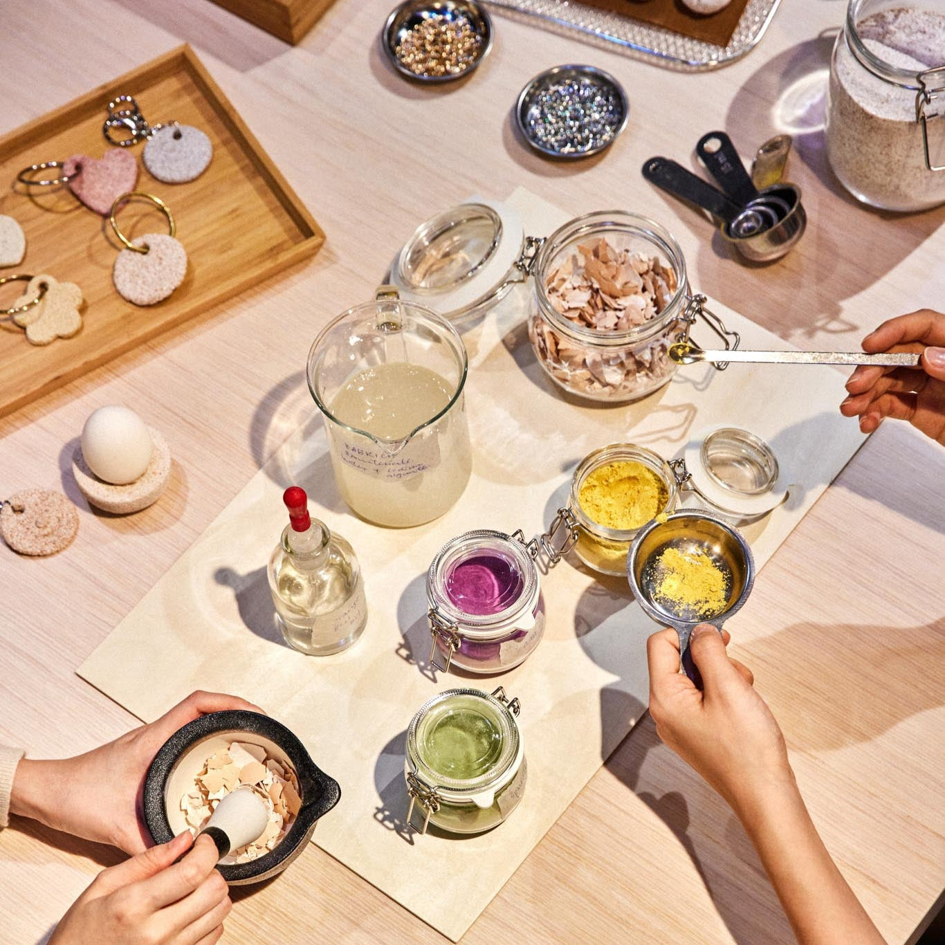 This workshop focuses on transforming food waste into eco-friendly accessories, introducing an alternative to non-renewable materials – “eggshell ceramics”. Through collaboration with the restaurants at The Mills, we collect discarded eggshells as the workshop material. Participants can also personalize their keychains using natural food colorants.