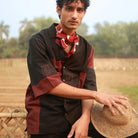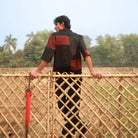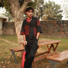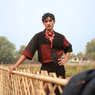 A bold, oversized unisex shirt featuring half sleeves, a classic collar, and button-down closure. Crafted with striking patchwork in black and deep maroon tones, it offers a sophisticated yet casual appeal for versatile styling.