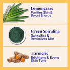 Sodium Cocoyl Isethionate (Coconut), Zea Mays Starch (Corn), Cymbopogon Flexuosus Oil (Lemongrass), Sodium Hyaluronate (Soy), Betaine (Sugar Beet), Hydrolyzed Rice Protein, Curcuma Longa Root Powder (Turmeric), Spirulina Platensis Powder, Hydroxypropyl Guar Hydroxypropyltrimonium Chloride, Zingiber Officinale Rhizome Extract (Ginger), Papain (Papaya Enzyme).