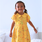 Let your little one twirl through the day in our adorable Dress in Pippin the Curious Kitten pattern. The dress features a sweet A-line silhouette with soft ruffle details at the waist, giving the freedom to play in style comfortably. Featuring a classic Peter Pan collar and adorable short ruffle sleeves, this dress blends timeless charm with playful energy. The cheerful and colorful pattern adds a pop of fun a perfect everyday outfit for playdates, parties, or casual strolls.