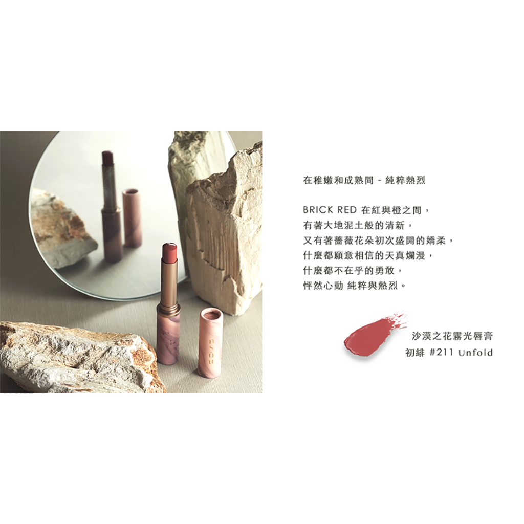 Inspired by flowers thriving in extreme desert environments, embodying a soft yet resilient life attitude. Highly pigmented mineral color matte lipstick, no pigment buildup or color clinging, easily removed with cleansing products. Enriched with Moroccan argan oil, almond oil, and plant-based lecithin, it reduces lip lines and improves the dry, flaky skin condition of traditional matte lipsticks. When used with a rare, soft-touch lip balm as a base, it delivers a fashionable matte glow without dryness.