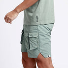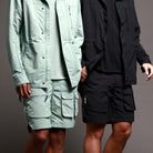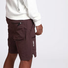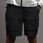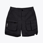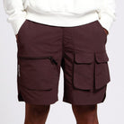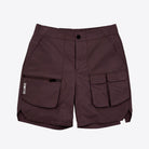 Functional multi-pocket shorts in a matte 100% Recycled Nylon crinkle effect fabric. Water repellent, snap button closure, 2 zippered pockets, 2 flap pockets and 2 open pockets.