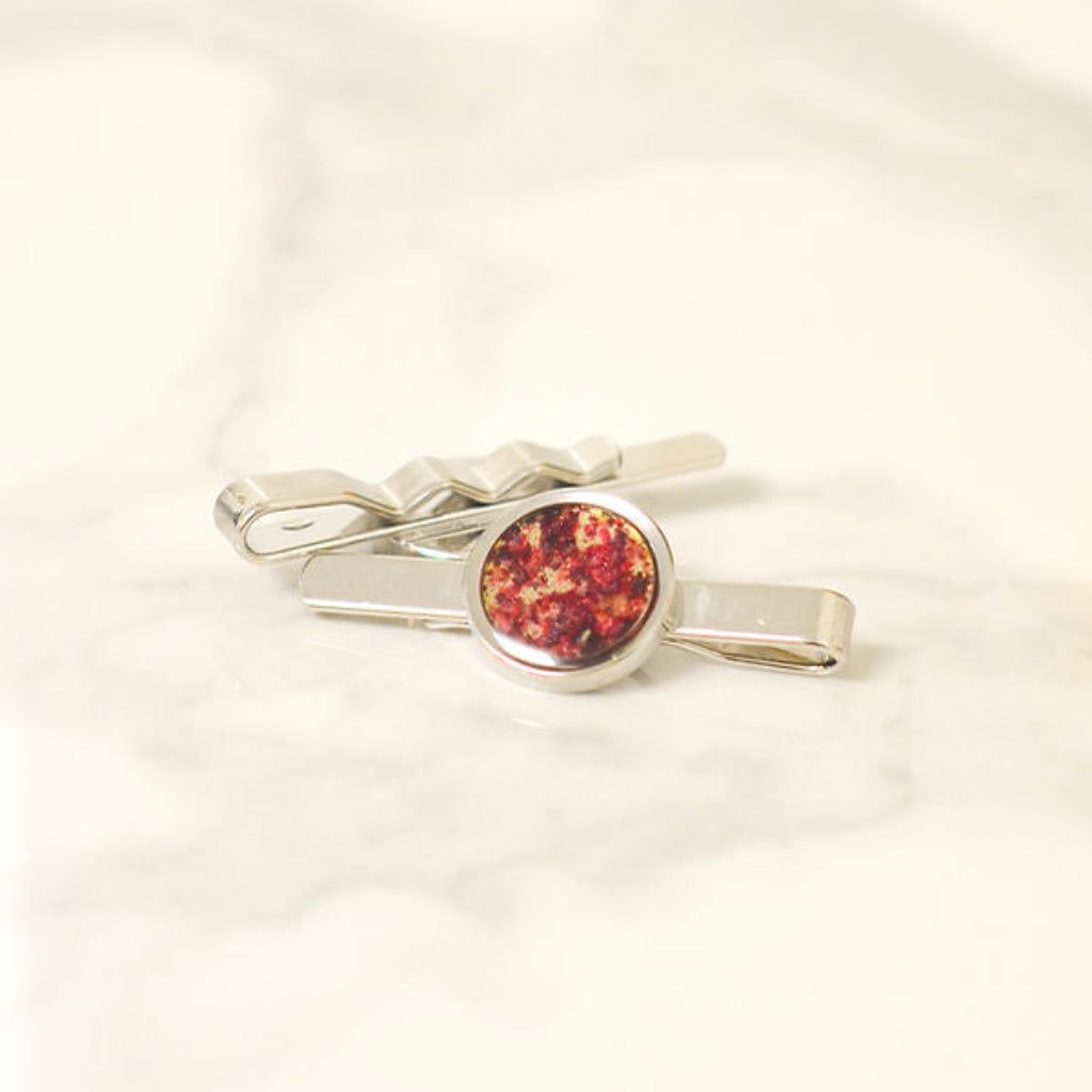 Drawn from red onion peels, this sustainable purple tie clip weaves together tension and grace threads of strength in layers of tenderness. Coin holders available in two metal colors.