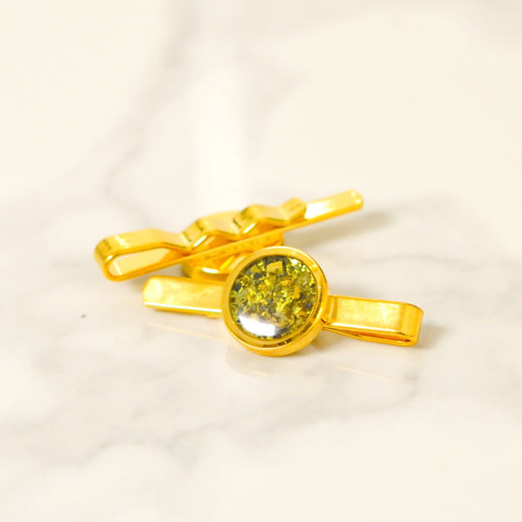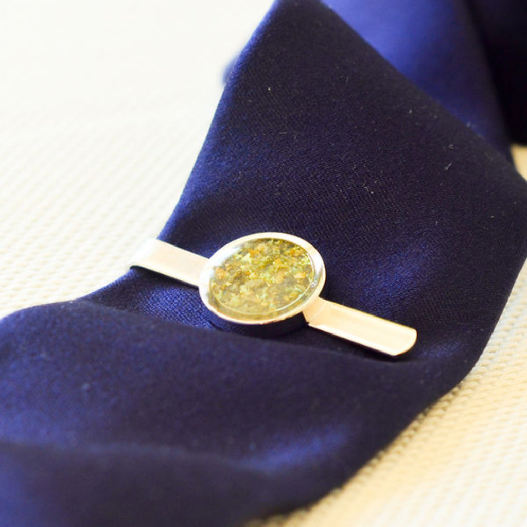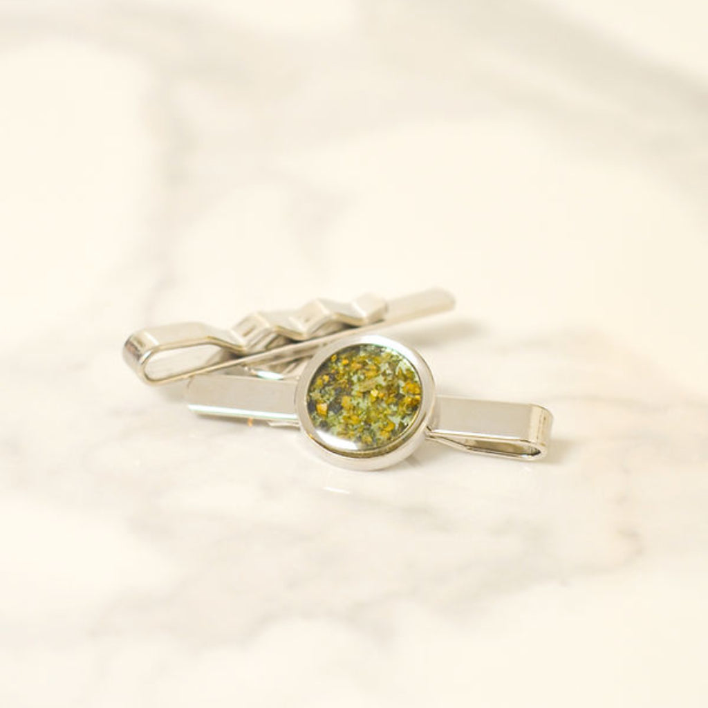 A symbol of renewal. The sustainable green tieclip from zucchini peels speaks to quiet beginnings, where softness meets strength. Coin holders available in two metal colors.