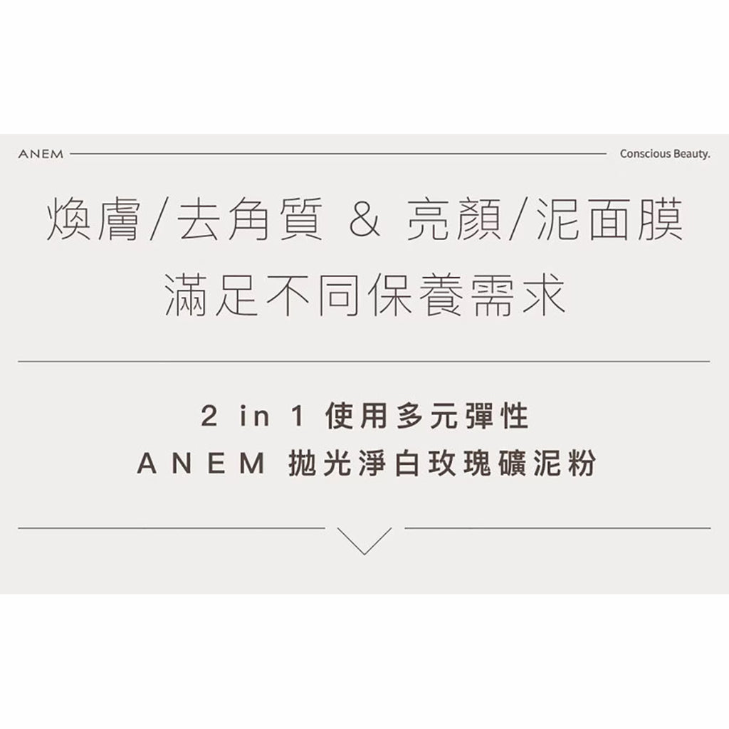 ANEM Polishing Whitening Rose Mineral Clay Powder, 2-in-1 can be used as an exfoliating polishing powder for face or body, or as a nourishing clay mask for versatile use. Contains kaolin mineral trace elements and finely ground nut seed shells, blended with active plant extracts. The fine, refreshing powder texture dissolves upon contact with water, releasing active elements.