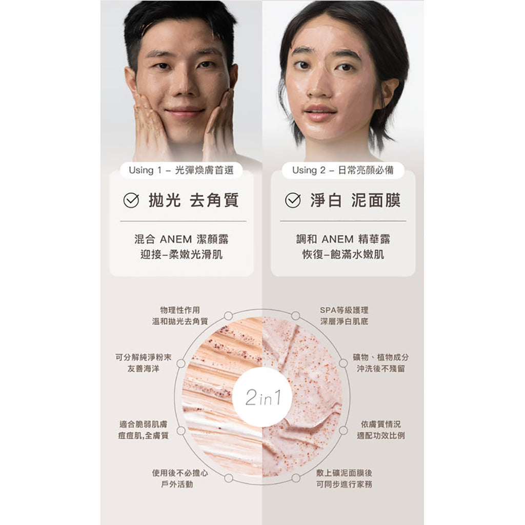 Customizable based on skin condition and needs, it can be mixed with ANEM SERENITY FOREST - The Hydrating Cleansing Gel or ANEM SERENITY FOREST - The Revitalizing Hydrating Serum for use. It cleanses while hydrating, absorbs dirt and excess oil, and provides deep purification and nourishment, achieving physical "skin renewal and brightening" effects. Made from ocean- and earth-derived biodegradable mineral and plant-based micro-particles, it leaves no residue after rinsing, offering a satisfying "leave-no-trace" experience.