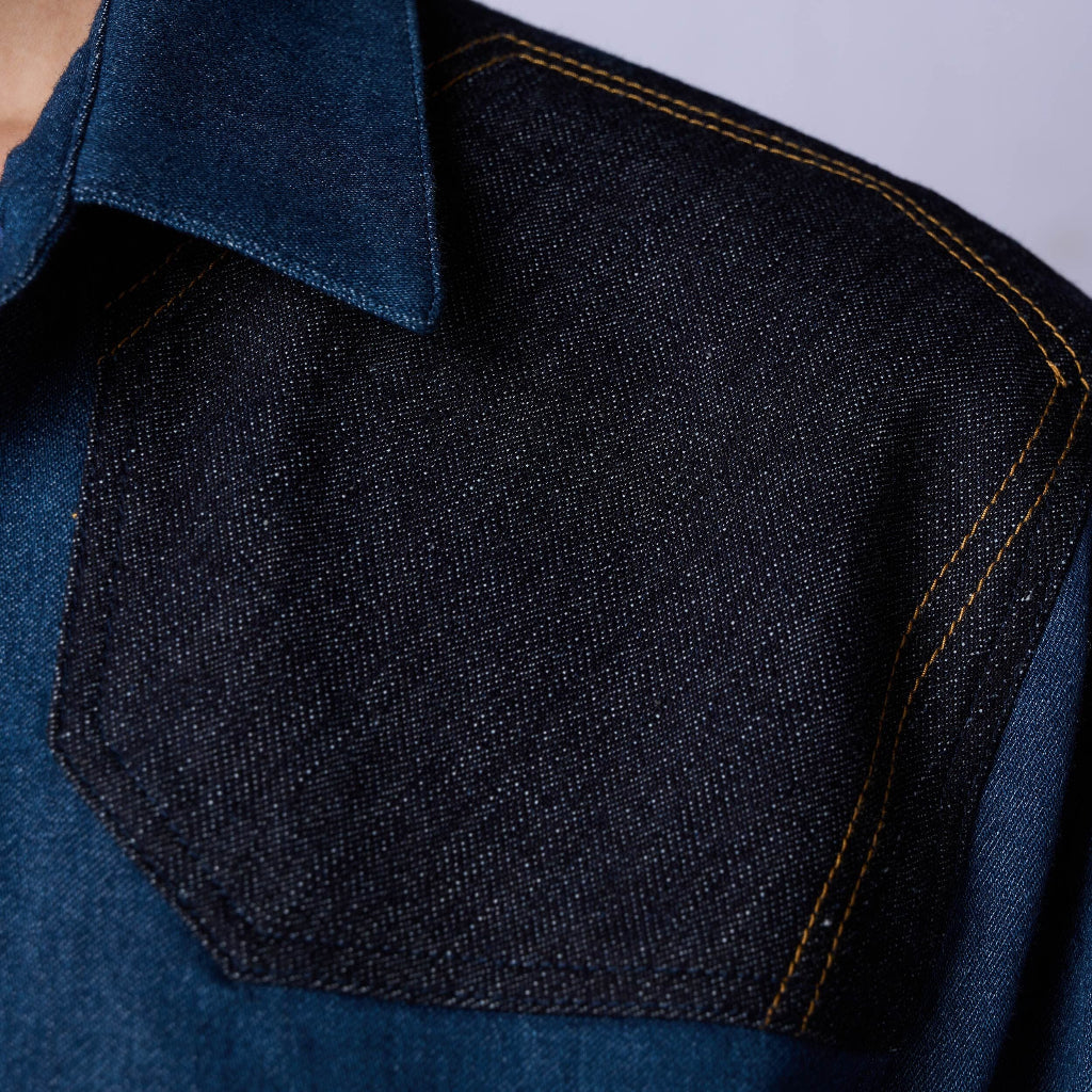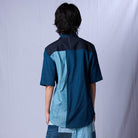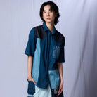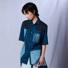 It's made from a patchwork of fabrics of different brightness levels to create a lively look of contrasting colors, and the shoulders are flattered with dark fabrics to flatter the width of the shoulders, and can be worn with wide shorts, wide straight-leg pants, and skirts for a casual look.