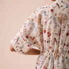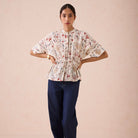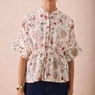 Relaxed fit, round-neck, half-sleeve peplum top that ties at the waist with a drawstring, crafted in handspun and handwoven organic cotton fabric, hand block printed with our signature nature-inspired motif using azo-free dyes. This piece is made in fabric that's completely made by hand from spinning the fibres to weaving it into fabric - all created by Indian artisans.