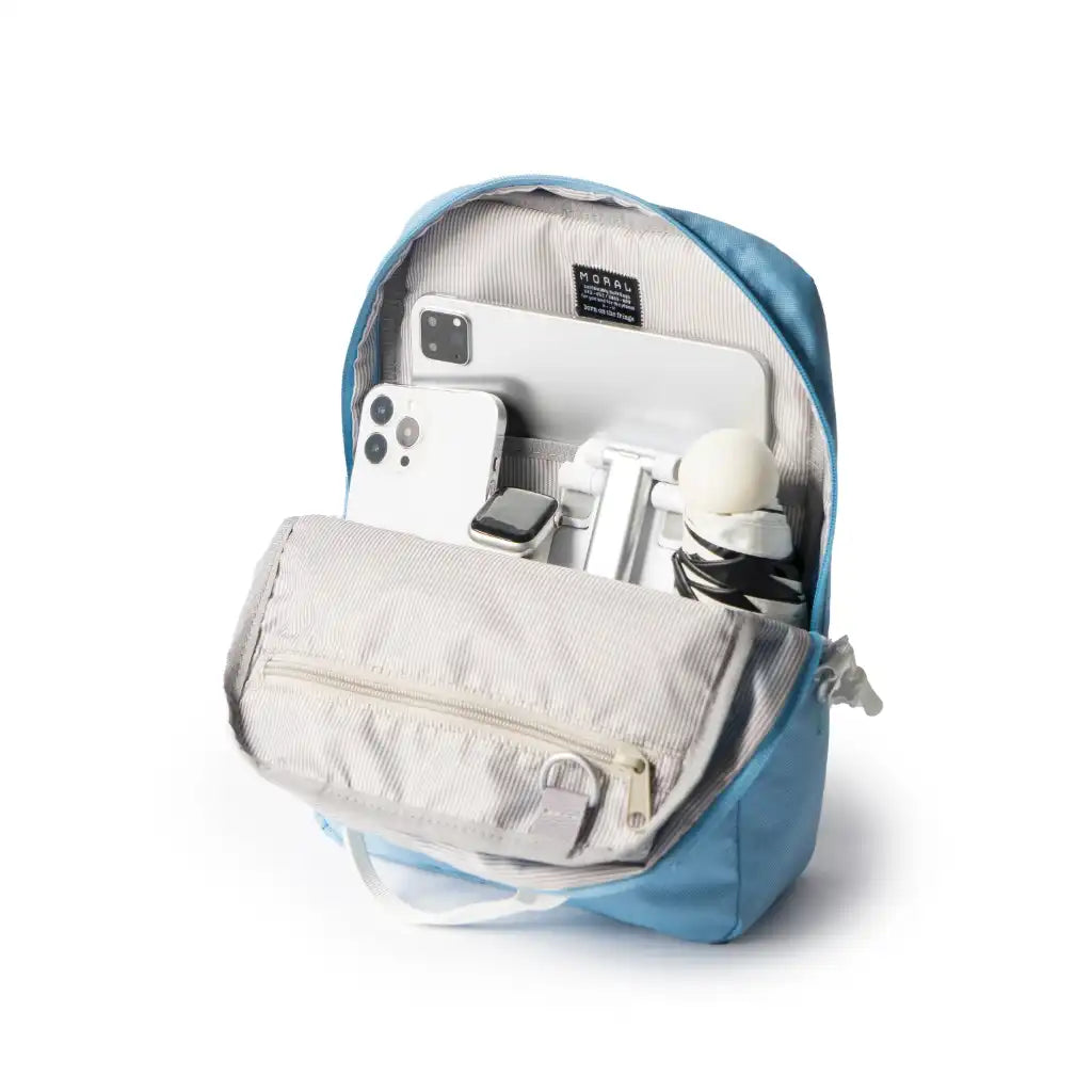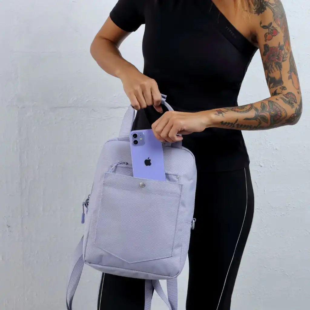 - Pockets: Quick access lower front pocket with snap button opening, zip pocket on upper front section to organise chargers, cables and other digital accessories, all zippers have silicone pullers, hidden security zip pocket on back panel, internal organiser pockets, detachable key clasp and expandable mesh pocket to organise water bottles or umbrellas