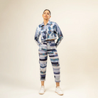 Fully patched zero waste short jacket with front placket and fully patched zero waste pants.
