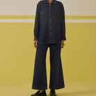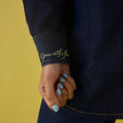 Regular fit, full sleeve, classic shirt that buttons in the front crafted in cotton denim fabric created with a blend of cotton and recycled cotton fibres, hand embroidered with heart and message motifs. A classic, staple shirt is versatile and can be endlessly mixed-and-matched to create a fresh outfit each time you put it on.