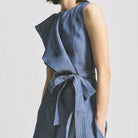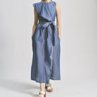 An asymmetric ruffle detail adds a playful, feminine flair to this midi-length dress. Made from luxurious Tencel denim and designed with practical side pockets, this stylish dress combines comfort and versatility, effortlessly allowing you to transition between casual and dressed-up occasions. Accentuating this ensemble is a meticulously topstitched belt, cinching the entire look to sculpt a flattering A-line silhouette.