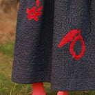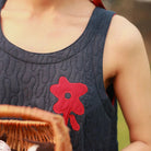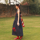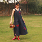 This sleeveless navy dress features a textured quilted pattern and playful hand-appliquéd red abstract motifs. Designed with a relaxed fit and a gathered drop-waist silhouette, it is perfect for casual outings or artistic flair.