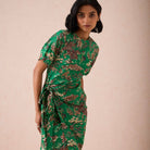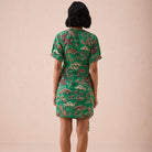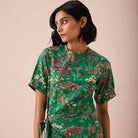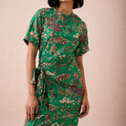 Fitted, short sleeve, mini wrap dress with tie at the hip, crafted in Tencel fabric, screen printed with our signature mountain-inspired motif using azo-free dyes. A staple everyday dress is a must for any sustainable wardrobe. This piece is made in fabric that's created from wood cellulose fibres (natural and renewable).