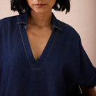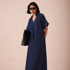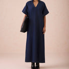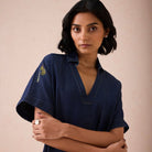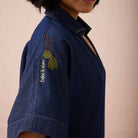 Relaxed fit, short sleeve, v-neck, collared maxi dress crafted in cotton denim fabric created with a blend of cotton and recycled cotton fibres, hand embroidered with message and leaf motifs. Timeless looks like this dress are a must for conscious closets. Dress it up with jewelry and heels for when you go out, or keep it super simple for casual occasions.