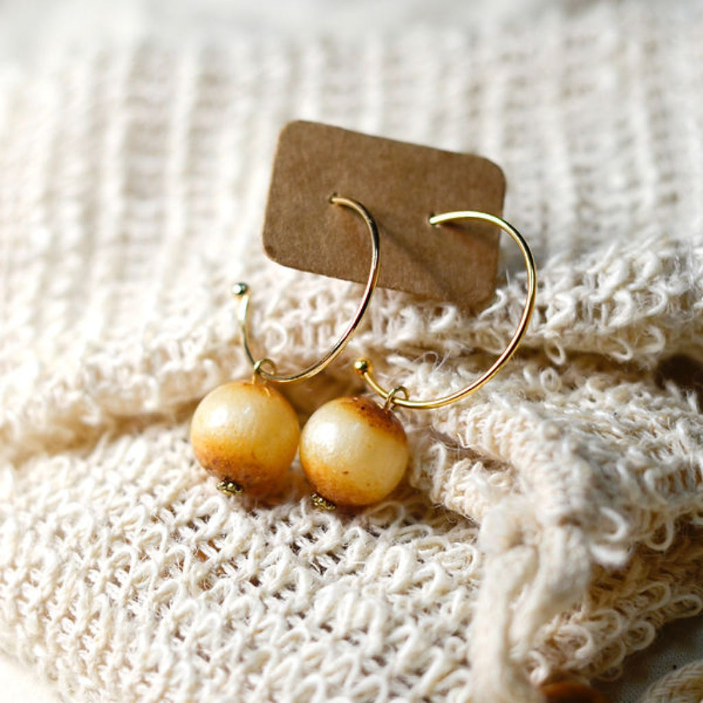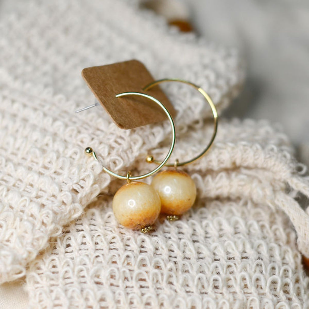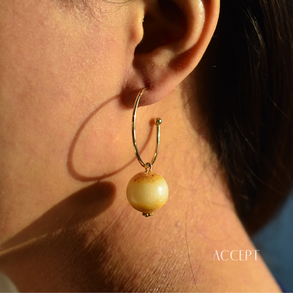 These simple and chic pairs of Accepter- Gold C-Hoop Sustainable Earrings with Big White Round Beads upcycled from orange peels, can take any looks from ordinary to extraordinary.