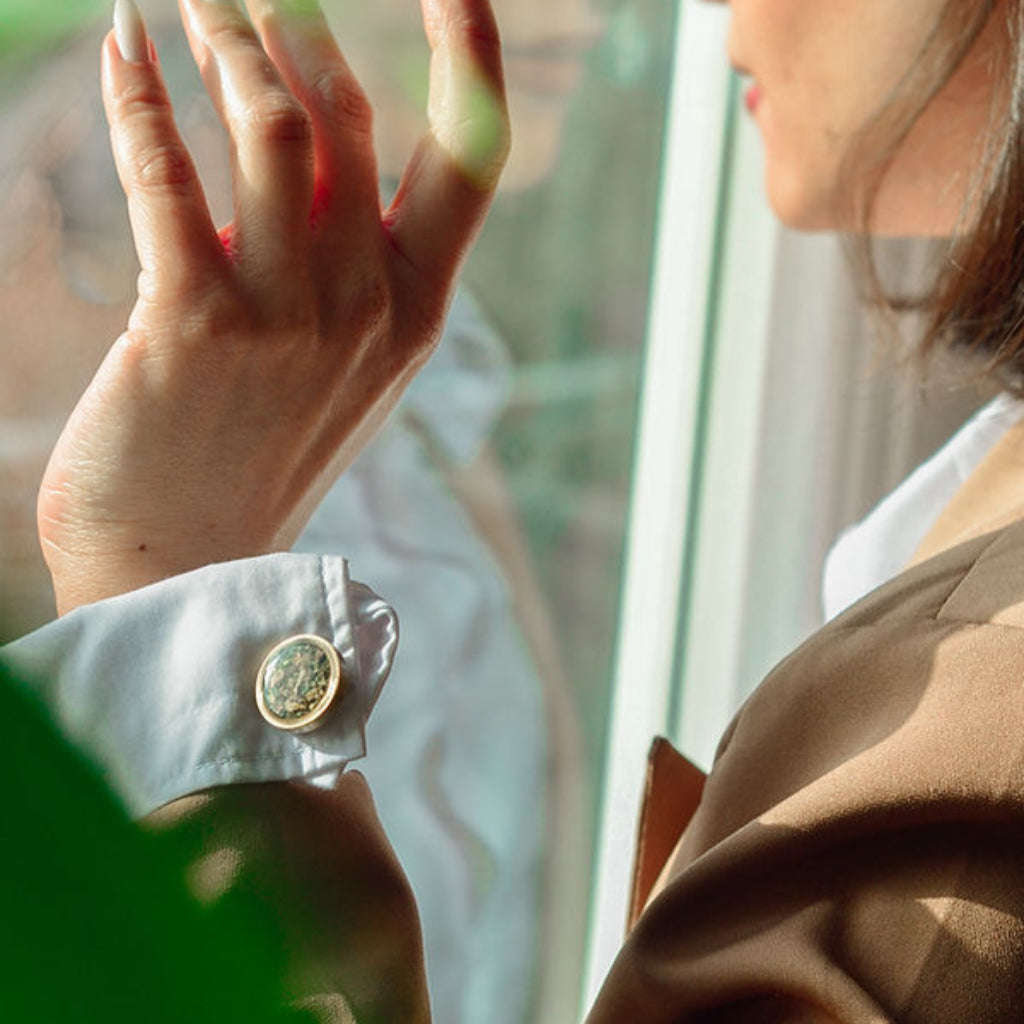 Growth happens in silence. These sustainable green cufflinks, made from zucchini peels, remind us that gentle restoration is its own kind of power. Coin holders available in 4 colors.