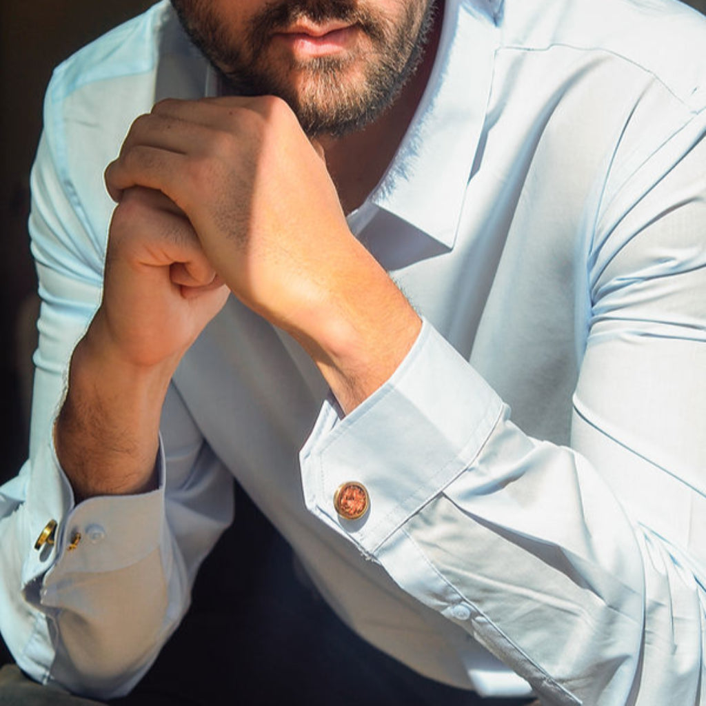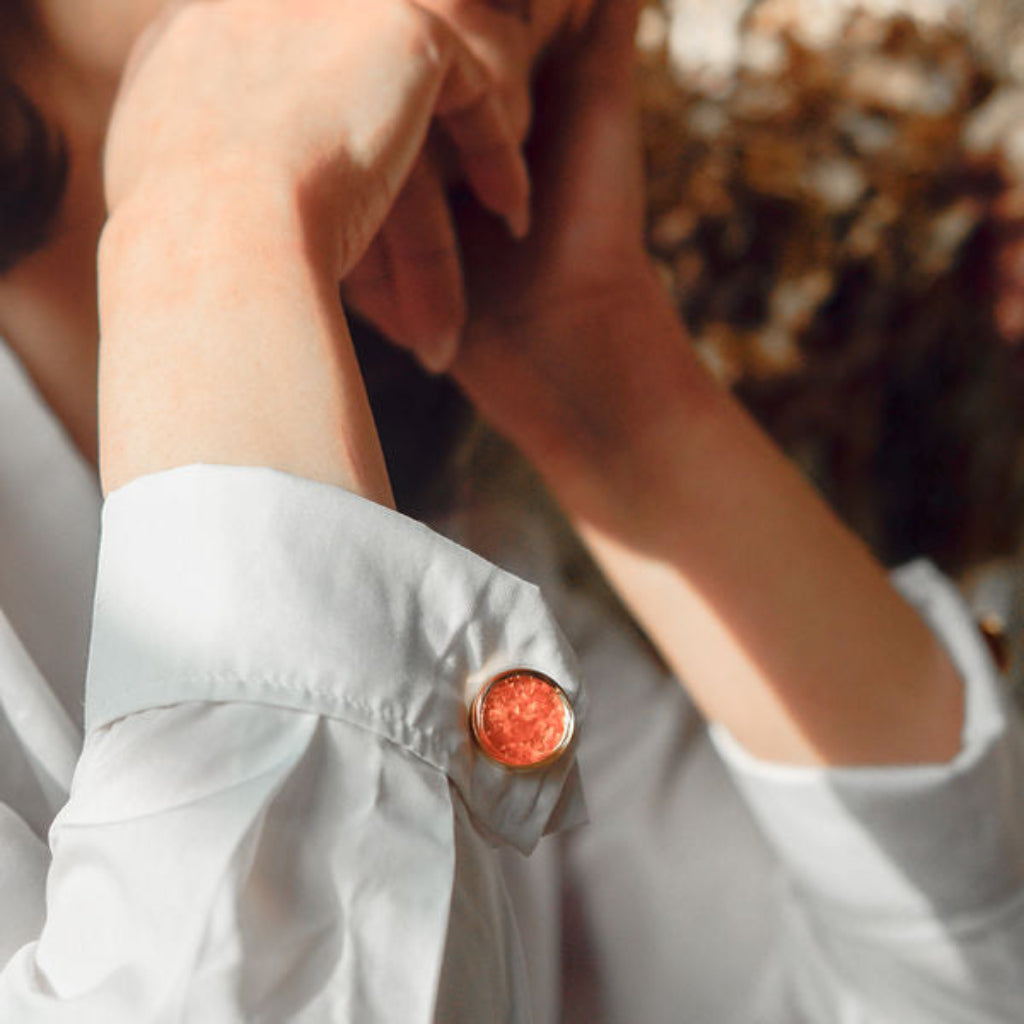 • Crafted from upcycled fruit peels and vegetable scraps, the 7-colored cufflinks channel the grace of stillness and the power of grounded presence. Like a soft light at dusk or a steady hand in the dark, these cufflinks offer quiet certainty strength that does not demand attention, but holds it nonetheless.