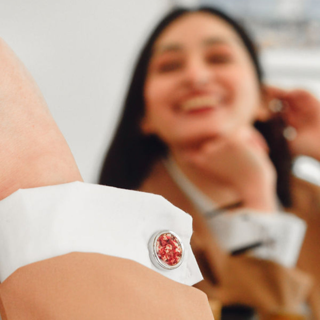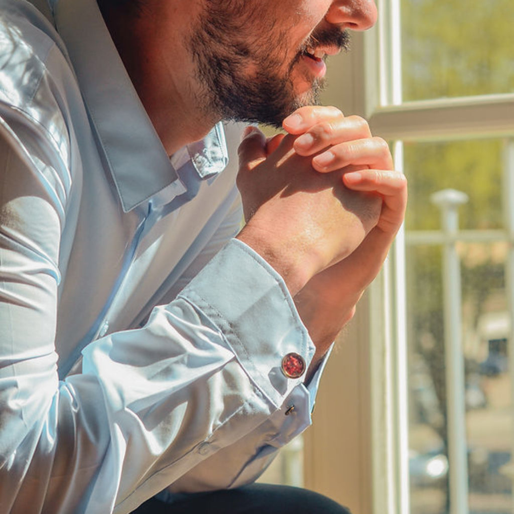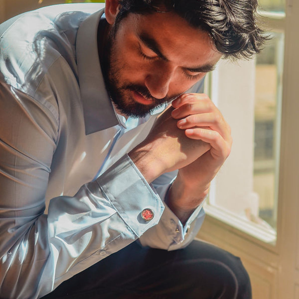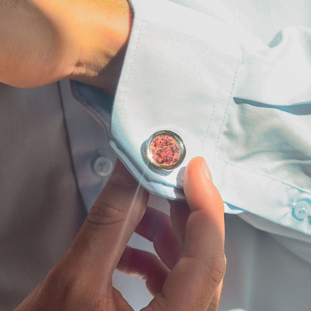 • Crafted from upcycled fruit peels and vegetable scraps, the 7-colored cufflinks channel the grace of stillness and the power of grounded presence. Like a soft light at dusk or a steady hand in the dark, these cufflinks offer quiet certainty strength that does not demand attention, but holds it nonetheless.