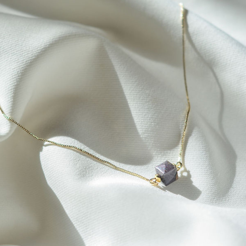 Upcycled by the eggplants peels, the Authentic gold sustainable necklace with purple cube bead is designed to celebrate women for her power to defy all the social expectations to become her authentic self.