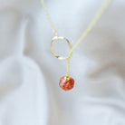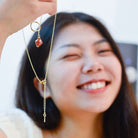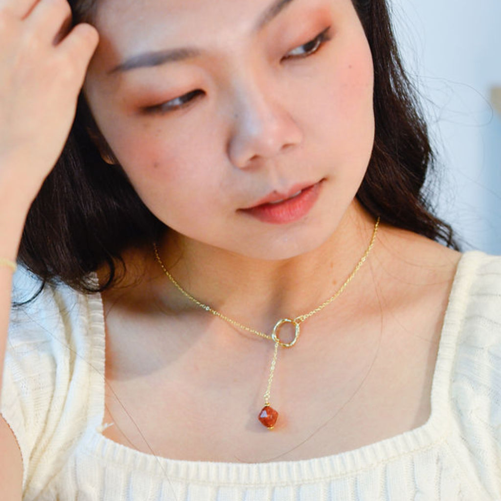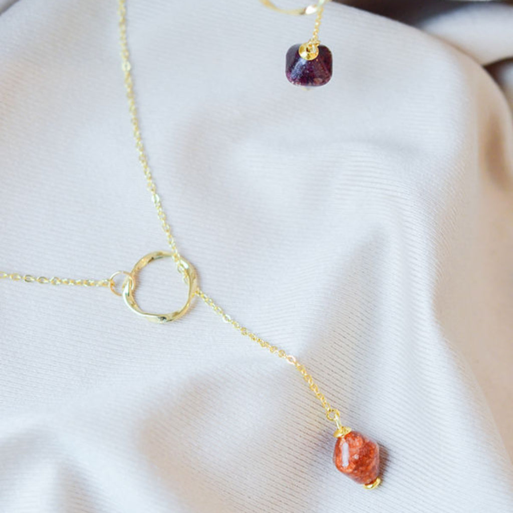 With gentle and gradual illumination of the landscape, <Dawn> the gold sustainable dangle necklace with its brown bead upcycled form brown onion peels, symbolizes the transition from night to day, with a promise of a new day with a new hope.