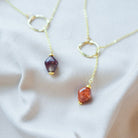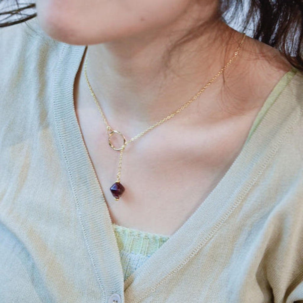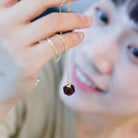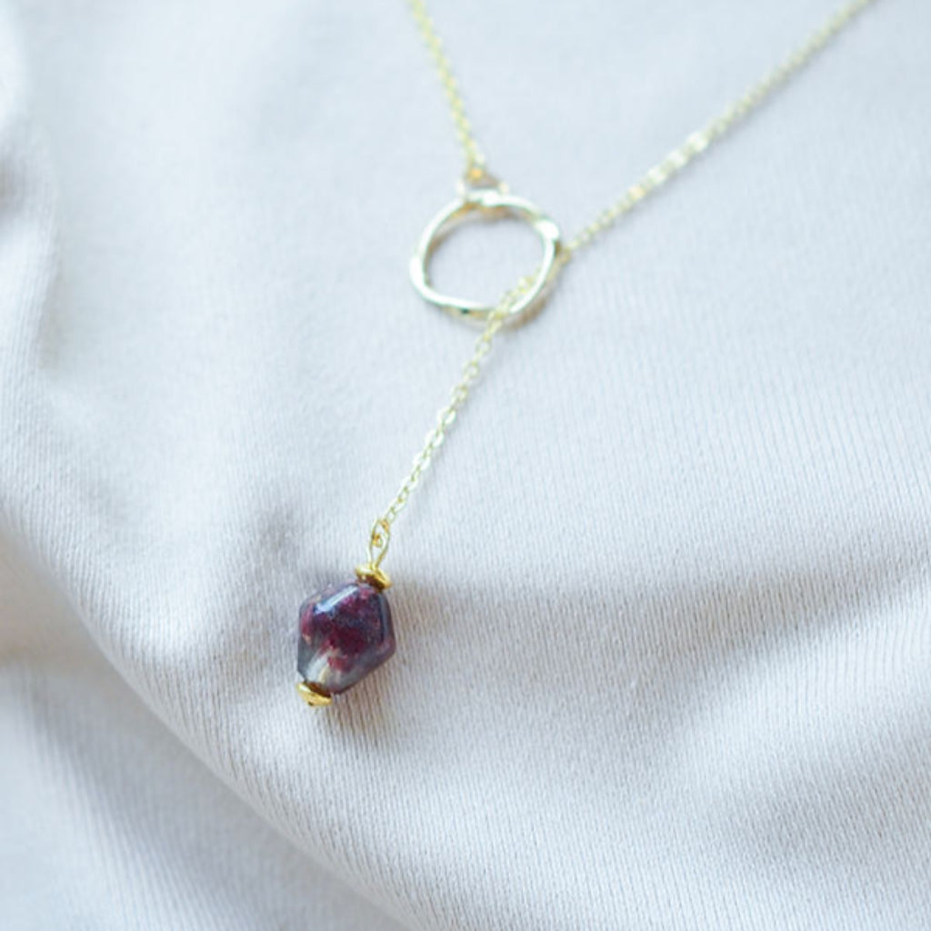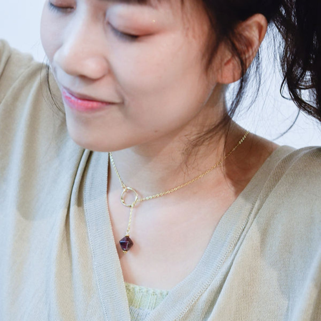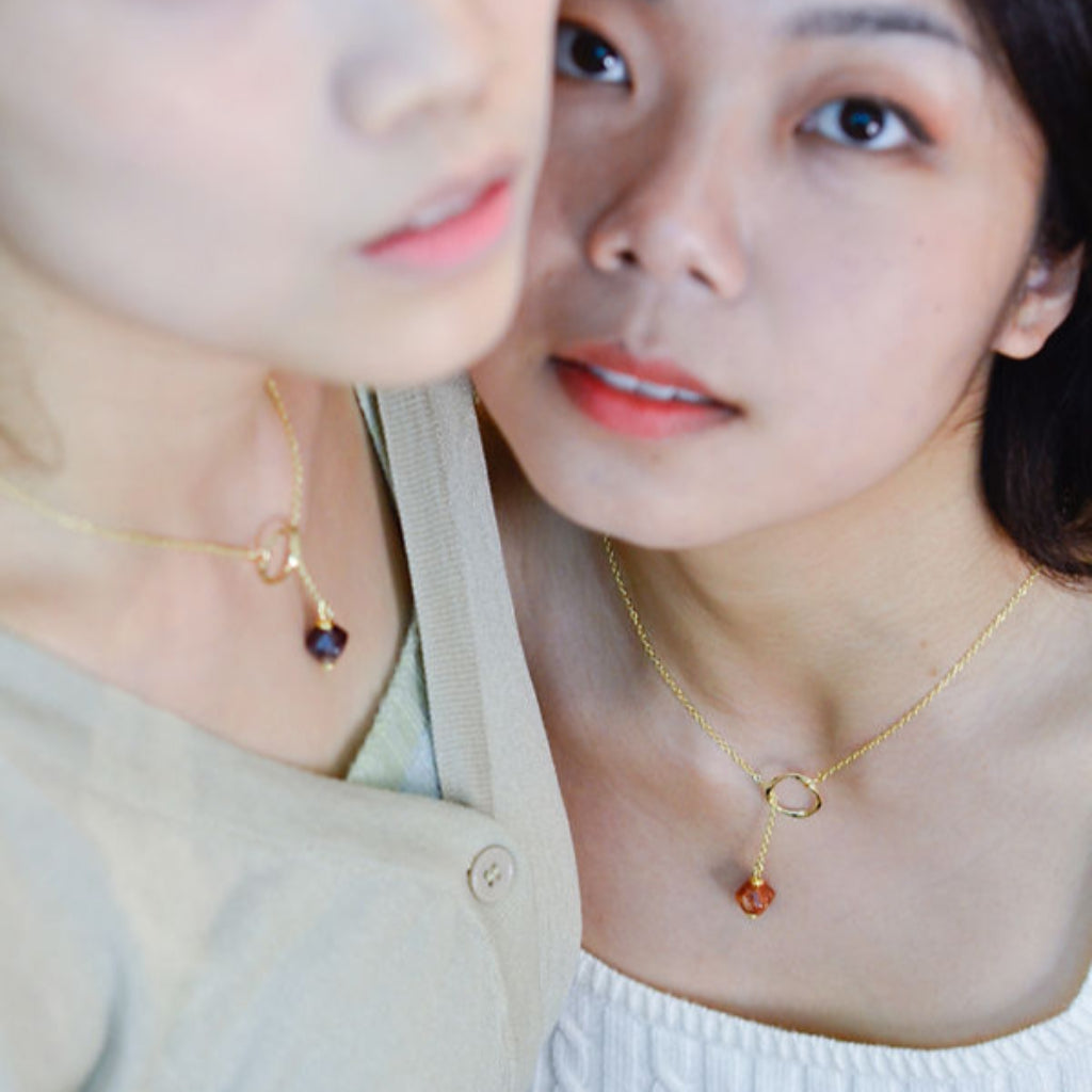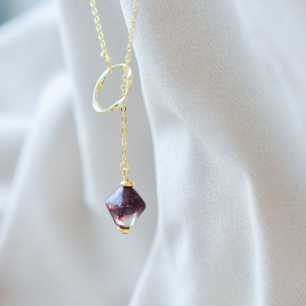 With gentle and gradual illumination of the landscape, <Dawn> the gold sustainable dangle necklace with its purple bead upcycled form red onion peels, symbolizes the transition from night to day, with a promise of a new day with a new hope.