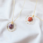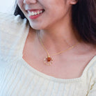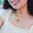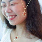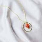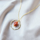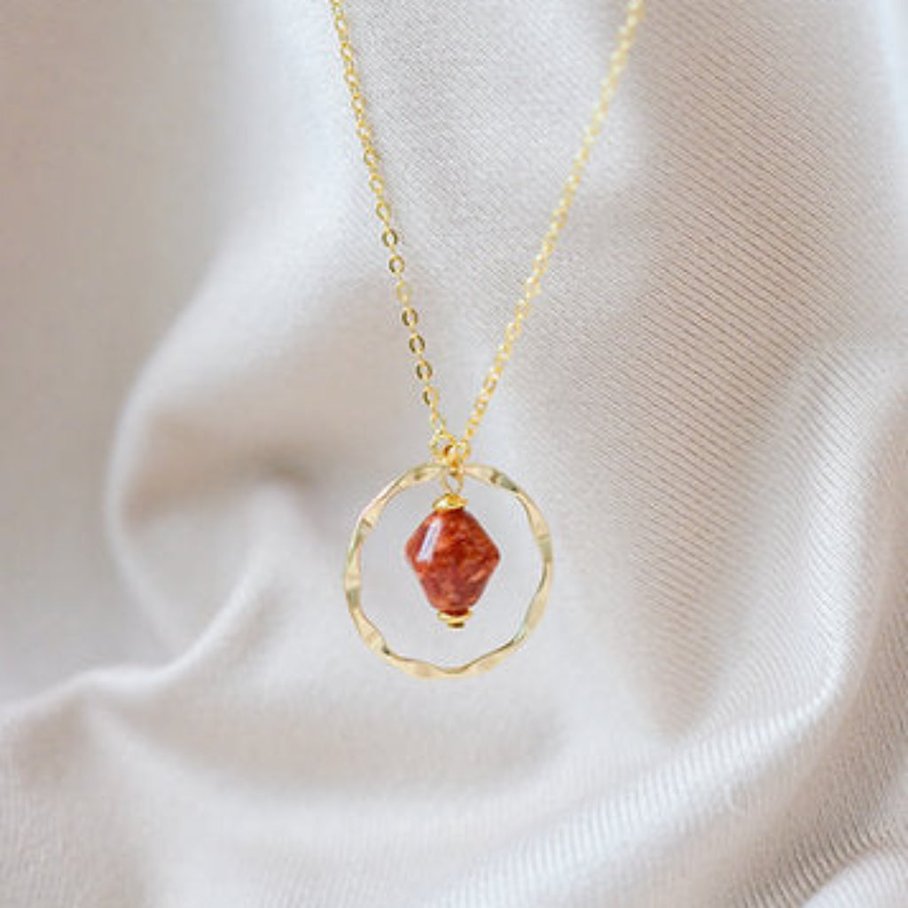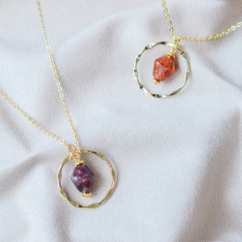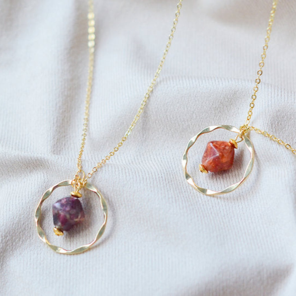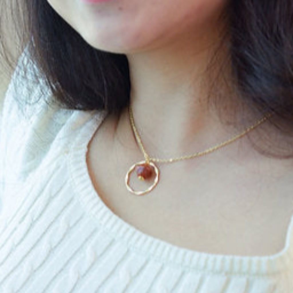Shimmering with the delicate colors of twilight, the Gold Sustainable Textured Circle Necklace with Brown Octahedron Bead upcycled from brown onion peels marks the celestial transitions that make nightfall a moment of quiet splendor.