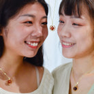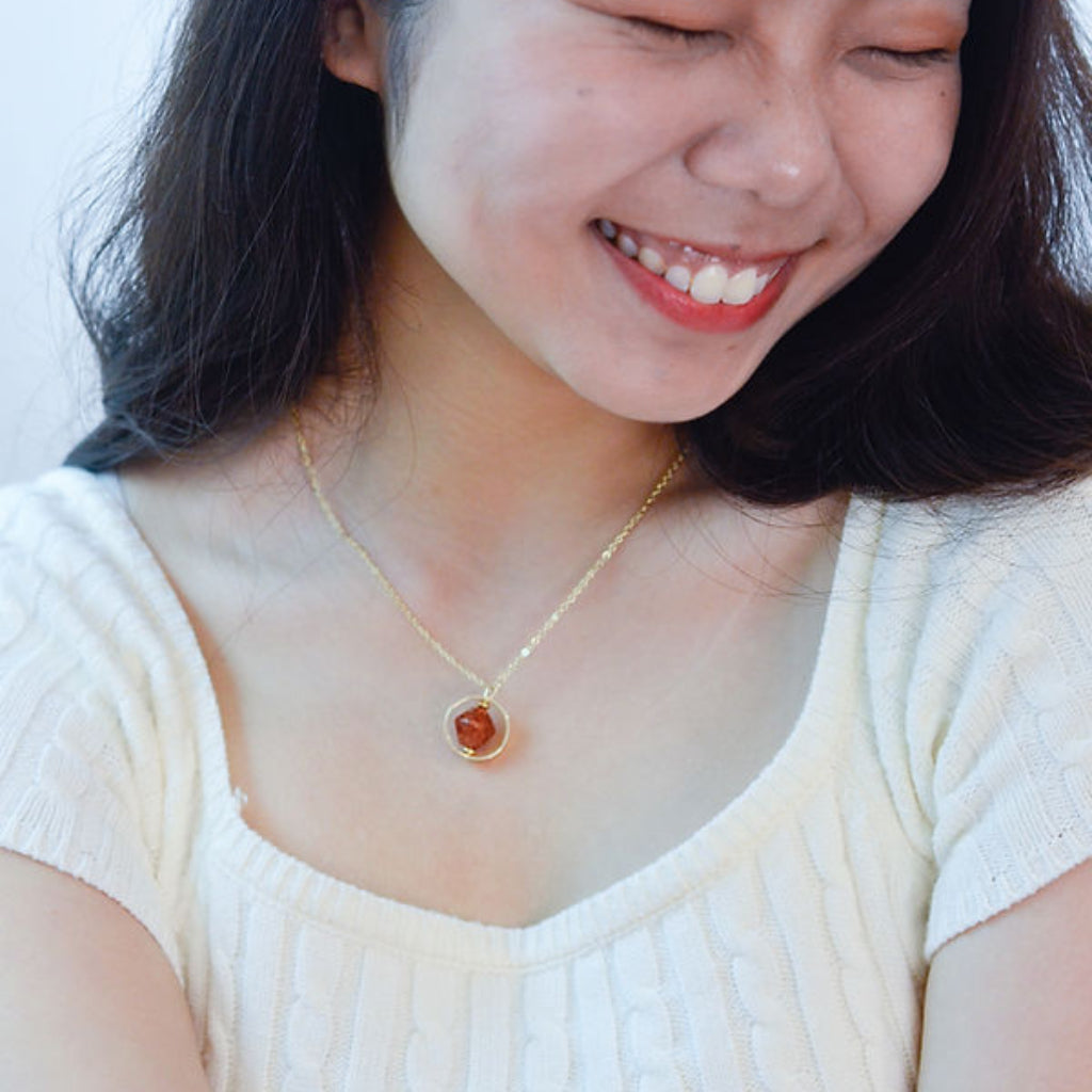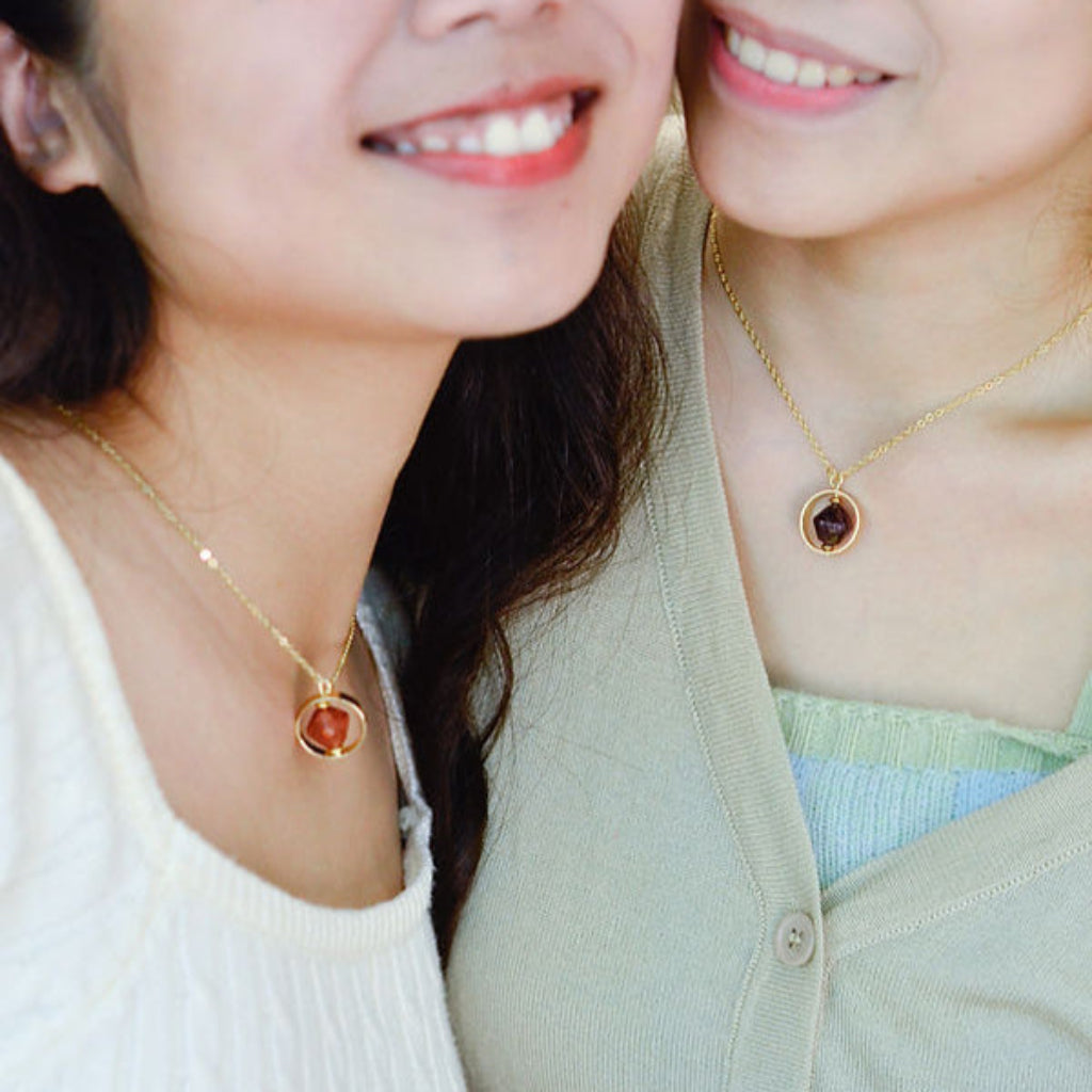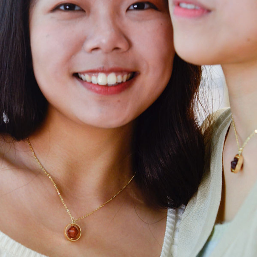 <Moonrise> the gold sustainable ring-pendant necklace, with its brown bead upcycled from brown onion peels, features a delicate crescent moon design and symbolizes the transition from day to night. From daytime outings to evening events, it gracefully adapts to your unique moments.