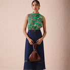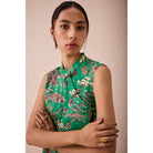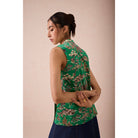 Regular fit, band collared, sleeveless top that half layers at the front and fastens at the neck with a button knot crafted in Tencel fabric, screen printed with our signature mountain-inspired motif using azo-free dyes. This elegant top is the perfect holiday look - something you can dress up and celebrate all your precious moments in, but it's also a great everyday staple! Just swap out your more formal skirts or trousers for your favourite denims and journey to your favourite cafes!