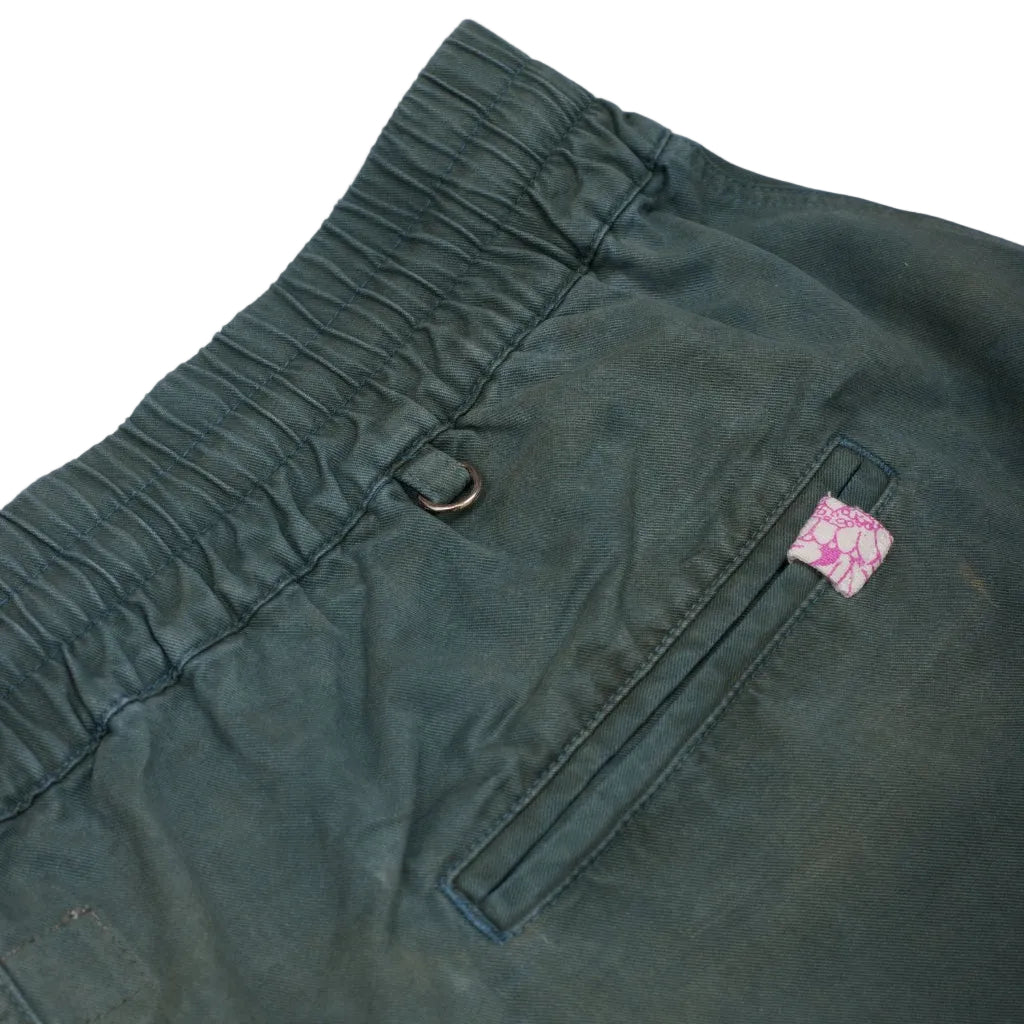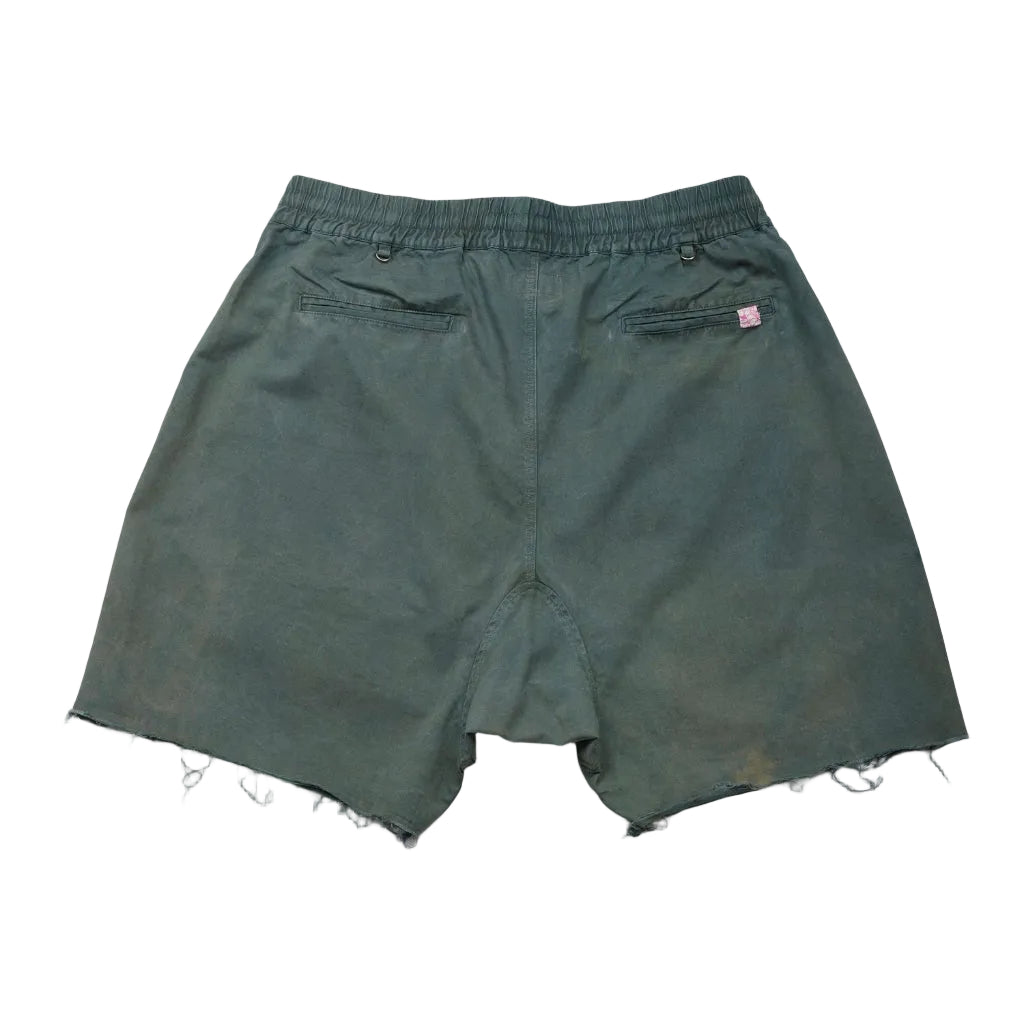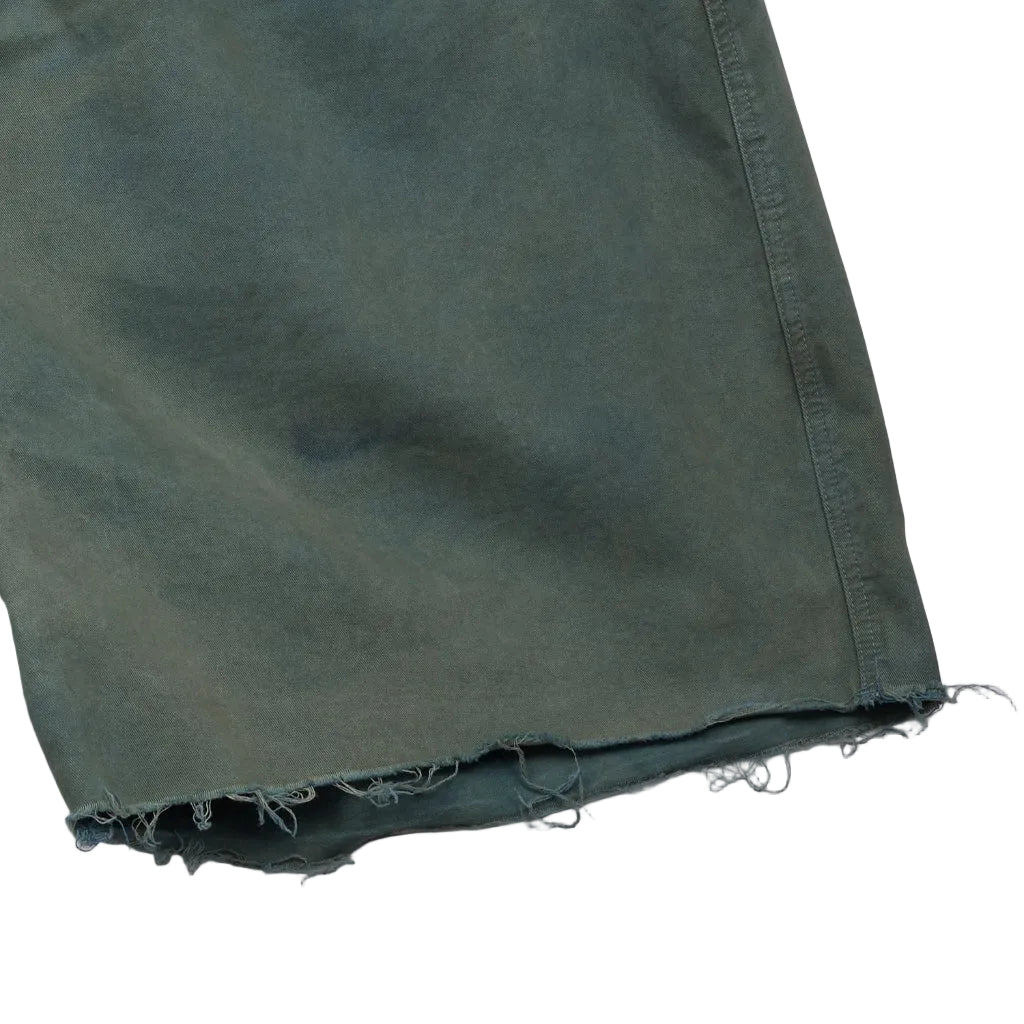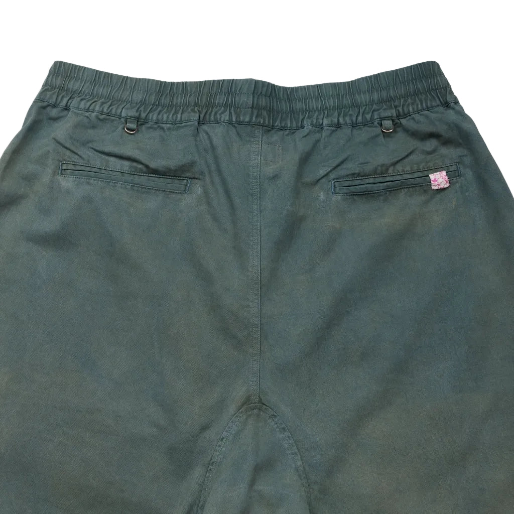 短褲在平靜的靛藍溶液中浸泡,急切地吸收染料。當它們完全氧化後,會經過細緻的沖洗。隨後,將服裝進行槐樹染料的浸染。隨著這種染料完成其轉變之旅,出現了豐富的森林般的綠色色調,為 Bonham 短褲注入了自然復古的美感。