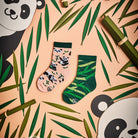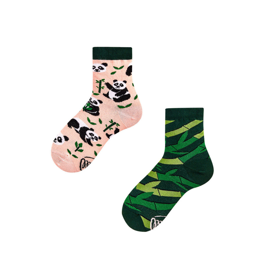 給可愛的孩子穿上鴛鴦/不對稱的襪子, 襪子以米色粉紅色背景, 設計概念來自熊貓朋友和他們最喜歡的竹子。