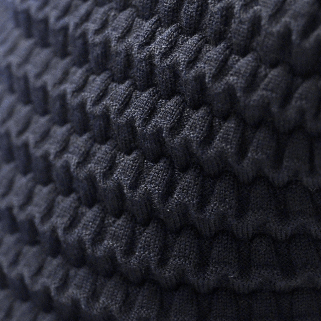 - 科技針織:這項創新技術打造出折疊結和張力,從而保持圍巾的形狀。因此,我們能夠使用天然纖維,並採用部分由再生能源驅動的機器,實現零浪費生產,幾乎沒有剩餘材料。