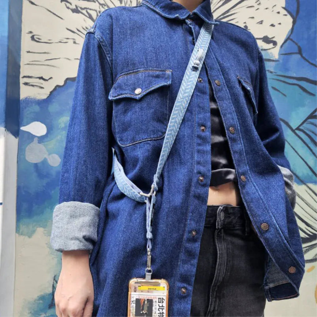 A versatile phone strap and ID lanyard with dual attachment loops for earphone cases, keys, and small essentials. Available in three patterns and finished with color‑coordinated metal clasps. Handmade in Taiwan from recycled denim for everyday function with sustainable style.